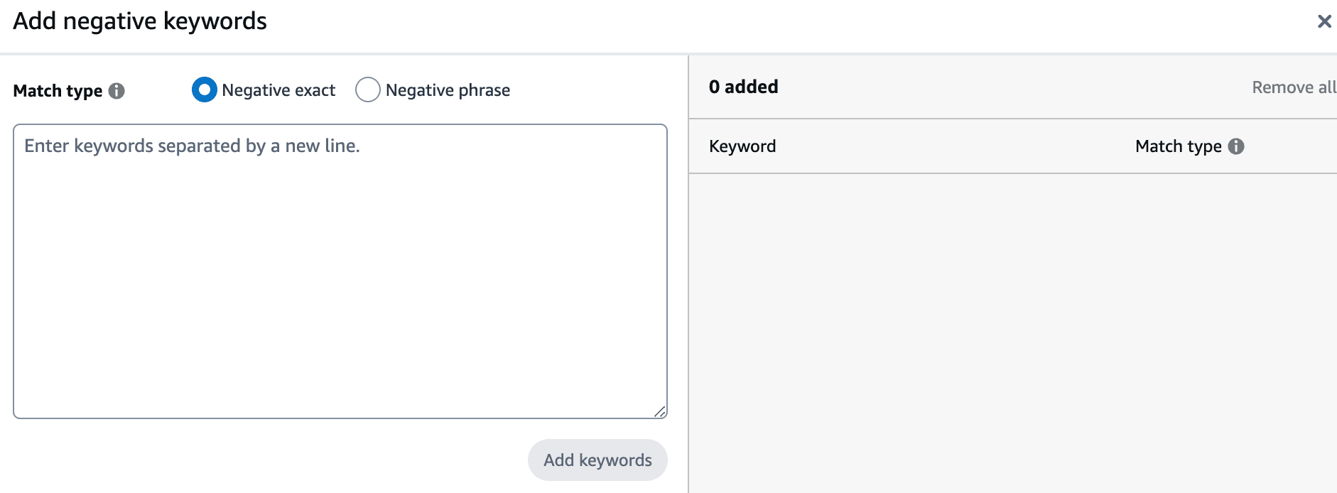 Next, choose your match type: either negative exact match or negative phrase match. Be sure to pick the right one based on how strict you want your keyword exclusions to be.
